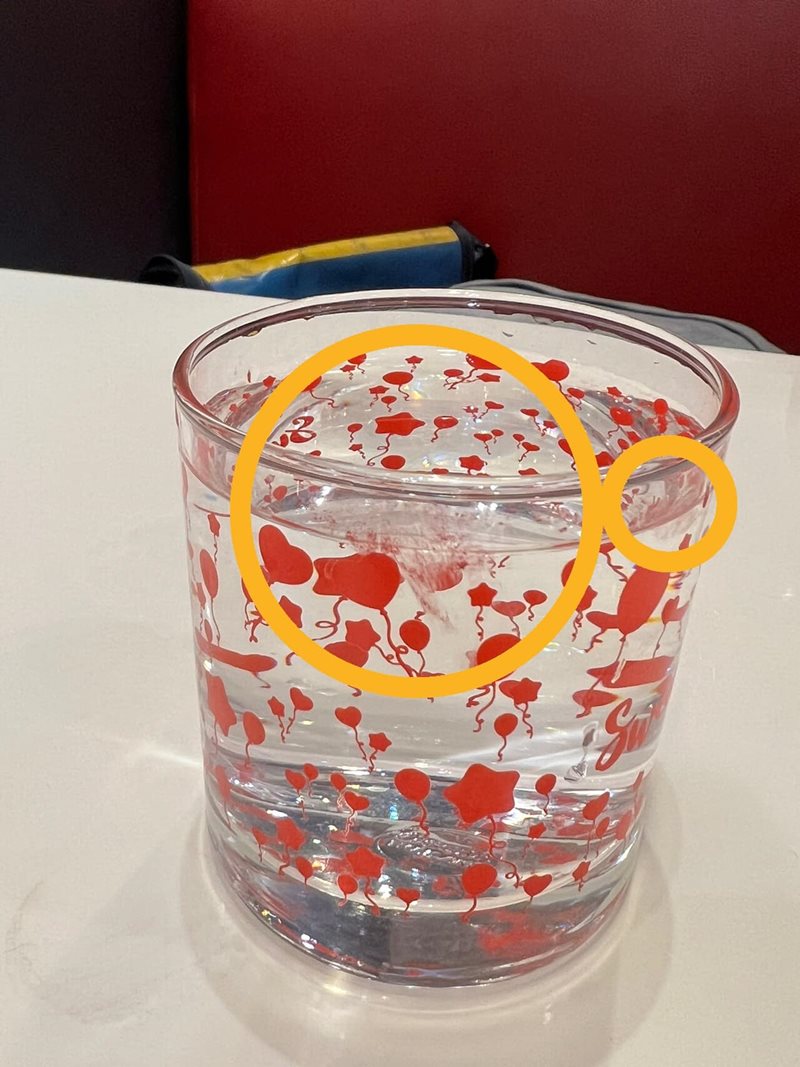 그래서 그녀는 그것을 손가락으로 문질러 보았더니 실제로는 립스틱 얼룩이었다는 것을 알게 되었습니다. 가게에서 안경을 청소해야 하는 경우 스펀지를 이용해 문질러주세요. 유리잔을 물에 담그거나 식기세척기에 넣어 세척하는 것만이 아닙니다. 이렇게 잘 지워지지 않는 얼룩은 나오지 않으니까요.