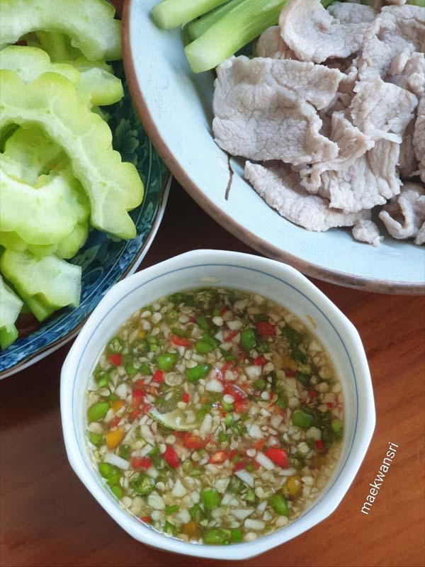 - 물을 끓여서 돼지고기가 완전히 익을 때까지 데칩니다(약 1분). 접시에 담습니다. 해산물 디핑 소스를 얹고 케일 식물과 함께 제공됩니다.
