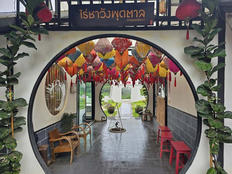 이곳은 치앙라이 주 도이 매 살롱의 왕풋탄 차 농장 입니다. 도착하자마자 우리는 원형의 중국식 출입문을 보고 바로 놀랐습니다. 붉은 등불로 장식 테이블과 좌석을 포함해 중국 서예 마치 중국에 다녀온 듯한 느낌을 줍니다.