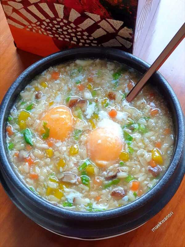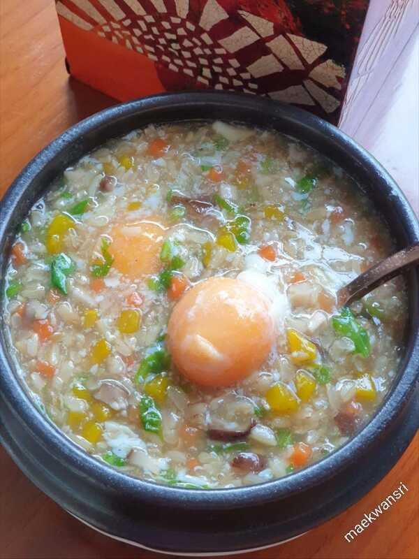 - 표고버섯을 넣고 5분 정도 끓인 후 호박, 당근을 넣고 간장과 약간의 설탕으로 간을 합니다. 쌀이 걸쭉해질 때까지 다시 끓입니다. 셀러리와 파를 넣고 섞습니다. 그런 다음 그릇에 담아주세요. 거기에 온천달걀을 깨뜨려주세요
