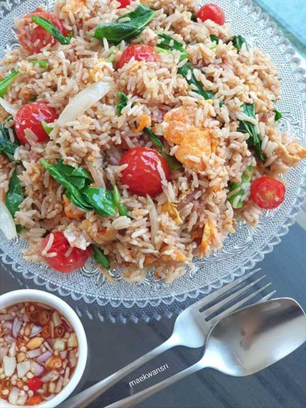 - 발효된 돼지고기와 찐 쌀을 넣고 섞으며 케일, 토마토를 넣고 굴 소스, 설탕, 간장으로 양념하여 야채가 잘 익을 때까지 잘 저어줍니다.