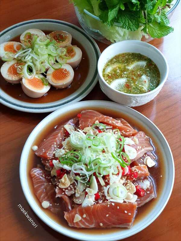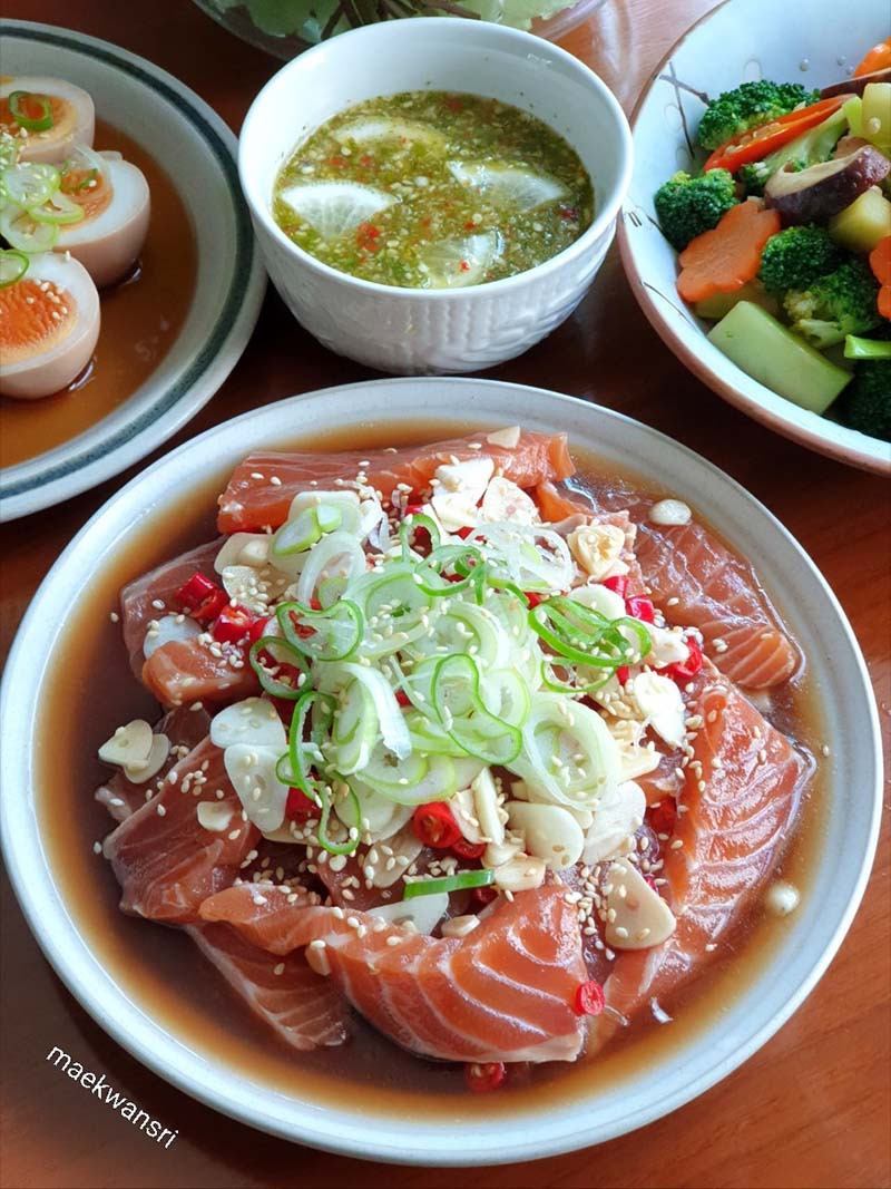 - 절인 연어를 양념장과 함께 접시에 담고 구운 참깨를 뿌린 다음 원하는 해산물 디핑 소스와 야채를 곁들여냅니다.