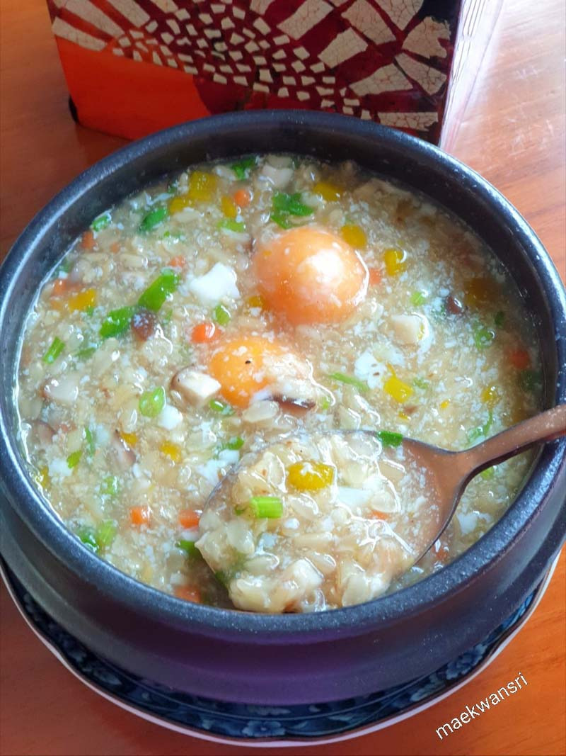 - 표고버섯을 넣고 5분 정도 끓인 후 호박, 당근을 넣고 간장과 약간의 설탕으로 간을 합니다. 쌀이 걸쭉해질 때까지 다시 끓입니다. 셀러리와 파를 넣고 섞습니다. 그런 다음 그릇에 담아주세요. 거기에 온천 달걀을 깨뜨려 주세요.