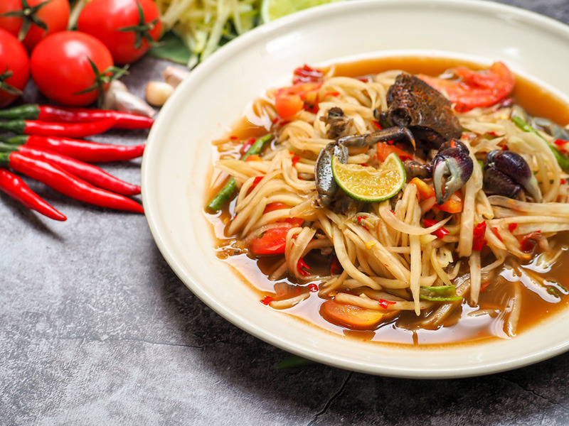 인스턴트 라면과 같은 게와 생선발효를 곁들인 파파야 샐러드, 통조림, 냉동식품, 스낵, 건오징어 짠맛이 두드러지는 각종 가공식품 이는 식품의 나트륨 함량으로 인해 발생합니다. 많이 먹으면 혈압이 올라가게 됩니다. 심장병과 뇌졸중의 위험을 증가시킵니다.