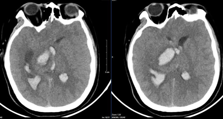환자는 혈전과 비정상 혈관을 제거하는 수술을 받았습니다. 집중치료에도 불구하고 그러나 치료 1개월 후에도 여전히 심각한 합병증이 있었고 환자는 여전히 의식을 잃었으며 왼쪽이 완전히 마비되었습니다.