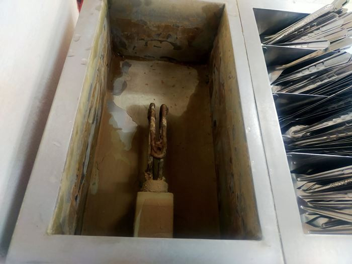 그림은 그것을 보여준다 기계에 있는 숟가락을 데우는 데 쓰인 뜨거운 물은 색깔이 전혀 없어야 할 텐데, 옅은 노란색이었습니다. 기기를 끄고 내부를 살펴본 결과, 원인을 발견했습니다. 뜨거운 물이 나오는 곳은 노란색으로 가득합니다. 하지만 가장 흥미로운 것은 열을 발생시키기 위해 튀어나온 철막대입니다. 녹슨 상태로 돌아갔다 이것이 물의 색깔이 이상한 이유일 수 있습니다.