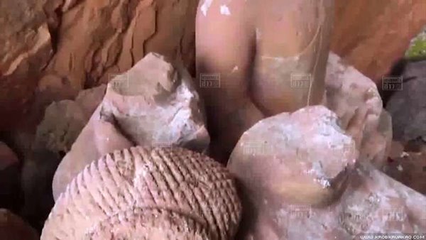 검사 결과, 동굴 보호소는 땅에서 약간 위에 있으며 로프를 타고 올라가서 검사할 수 있습니다. 동굴 내부에는 붉은 사암으로 조각된 고대 불상이 있습니다. 작은 것들도 많고, 바퀴 폭이 50cm 정도 되는 큰 것 하나도 있는데, 모두 파손된 상태다.
