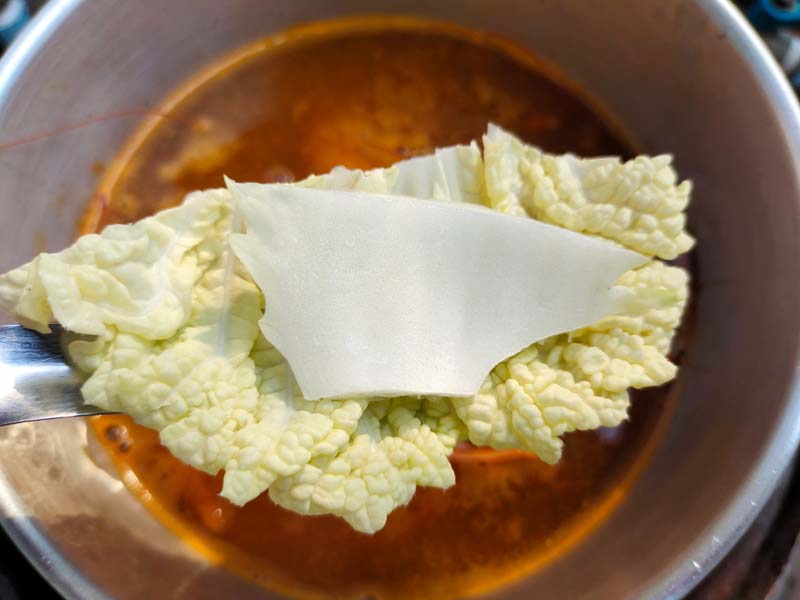 4. 배추를 넣고 잘 섞일 때까지 저어줍니다.