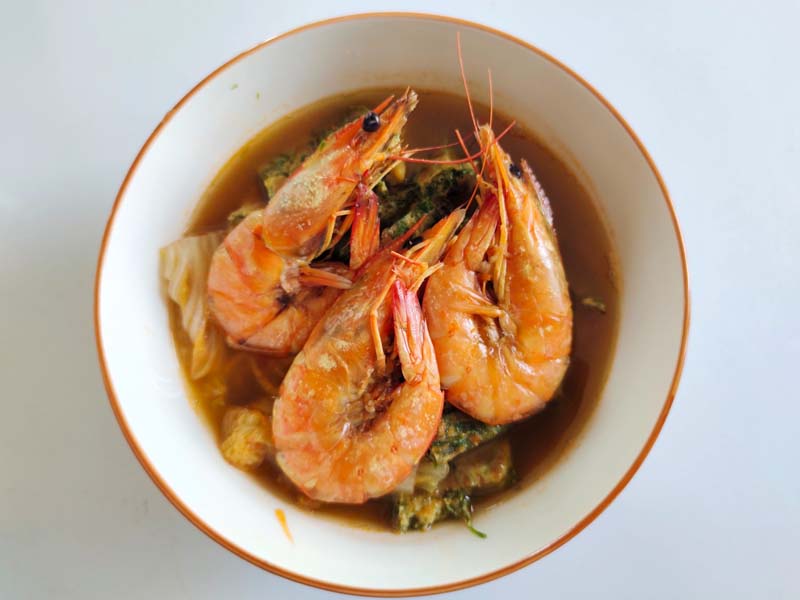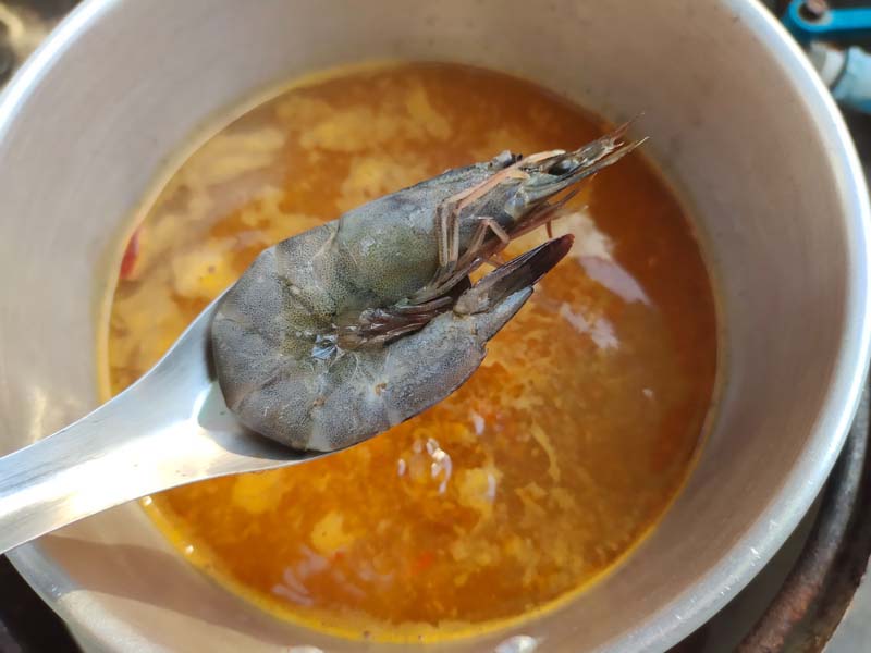 3. 물이 끓으면 그럼 새우를 넣고 끓여주세요. (아직도 원하는 맛이 없다면 액젓, 야자당, 타마린드즙으로 양념하시면 됩니다.) 활은 제가 직접 찧은 카레 페이스트라 가장 맛있다고 자부할 수 있어요.