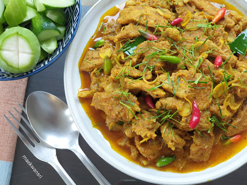 매콤하게 볶은 돼지고기, 남부 카레 페이스트로 만든 매콤한 태국 음식입니다.